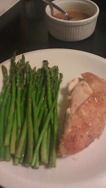 Roasted chicken breast with asparagus and dijon pan sauce.