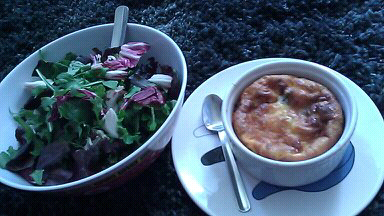 Crustless quiche and an herb salad with chevre and balsamic vinaigrette.